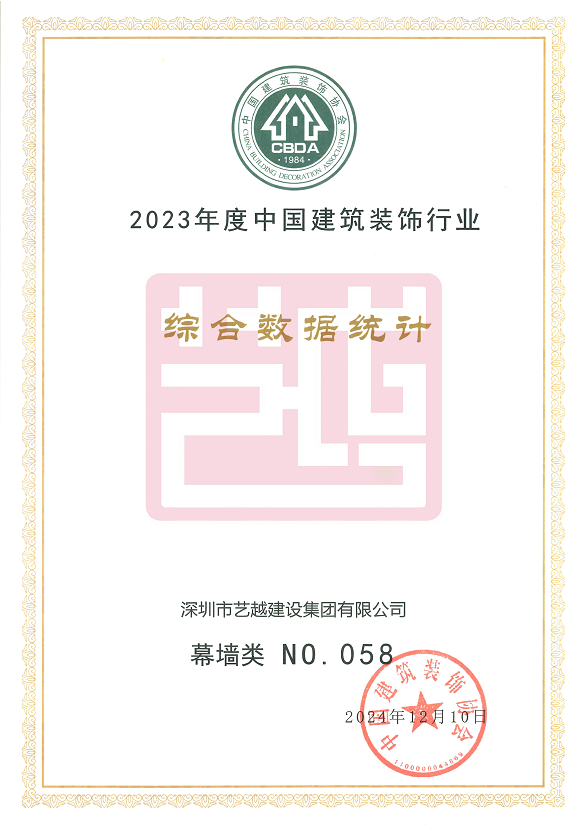 深圳市藝越建設集團有限公司,成立于2010年10月22日,注冊資金為6180萬元,是一家是集建筑、室內外裝飾設計與施工、智能化、市政于一體的綜合性、專業化的集團公司。具有建筑裝修裝飾工程專業承包壹級、建筑幕墻工程專業承包壹級、建筑機電安裝工程專業承包壹級、消防設施工程專業承包壹級、鋼結構工程專業承包壹級、中國展協展覽工程企業壹級、中國展協展覽陳列工程設計與施工壹級、潔凈工程資質壹級、防水防腐保溫工程專業承包壹級、特種工程(結構補強)不分等級、建筑裝飾工程設計專項甲級、建筑幕墻工程設計專項甲級、輕型鋼結構工程設計專項乙級、消防設施工程設計專項乙級、建筑工程施工總承包貳級、市政公用工程施工總承包貳級、電子與智能化工程專業承包貳級、城市及道路照明工程專業承包貳級、環保工程專業承包貳級、施工勞務不分等級、承裝(修、試)電力設施許可證五級、醫療器械經營許可資質貳、叁類、安全技術防范系統設計施工維修資格。質量管理體系(GB/T19001-2016 / ISO9001:2015)標準認證、職業健康安全管理體系(GB/T28001-2011)標準認證,環境管理體系(GB/T24001-2016/ISO14001:2015)標準認證。中國建筑裝飾協會常務理事單位、AAA資信單位、連續十二年被評為“守合同重信用企業”。